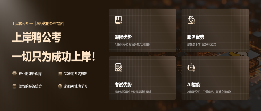 上岸鴨公考,高頓旗下公職教育品牌,20+個省市開設培訓中心。“讓每一個學員都能成功上岸”是上岸鴨公考一直秉持的目標。從公考學習的核心需求出發,堅持研發真正適合公考人群的課程產品和教學模式。